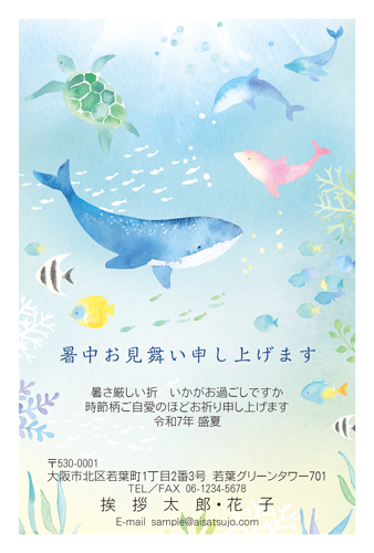 - 水彩のグラデーションを活かして、海の中の生き物たちを爽やかに描きました。