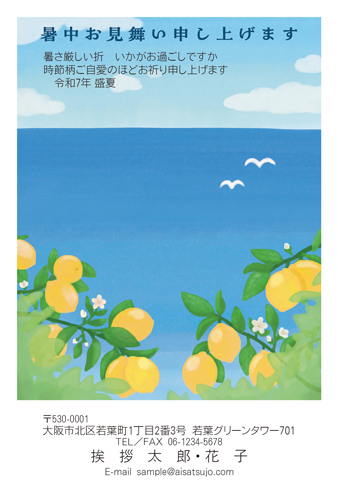 - 真っ青な空と海にフレッシュなレモンが映える爽やかなデザイン。