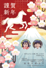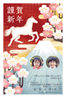 - 駆け上がる白馬、紅白の梅、富士山を組み合わせ、おめでたい年賀状に仕上げました。