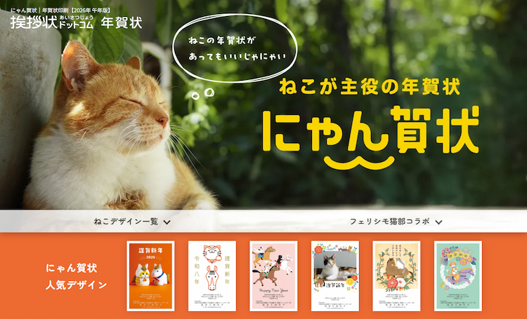 可愛らしいねこのデザインを集めたにゃん賀状は毎年人気を博す定番企画となっており、挨拶状ドットコムにおいて、猫は年賀状選びにおけるもう一人の主役といっても過言ではありません。