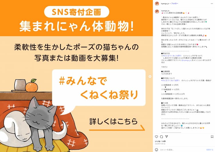 昨年度のコラボでは、特設サイトにてフェリシモ「猫部」オリジナルデザインの年賀状が注文できるほか、抽選でオリジナルアクリルキーチャームが当たる購入者キャンペーンのほか、投稿数に応じた金額を動物保護団体へ寄付するにゃん賀状SNS企画など、猫にまつわるさまざまな企画を実施しました。