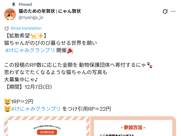 X・Instagramにてハッシュタグ「#けにゃみグランプリ」をつけて投稿しご参加いただくことで、キャンペーン期間中に集まったRP数・シェア数に応じた金額を動物保護団体へ寄付するねこちゃんのための企画となっておりますので、ぜひご参加ください🐈