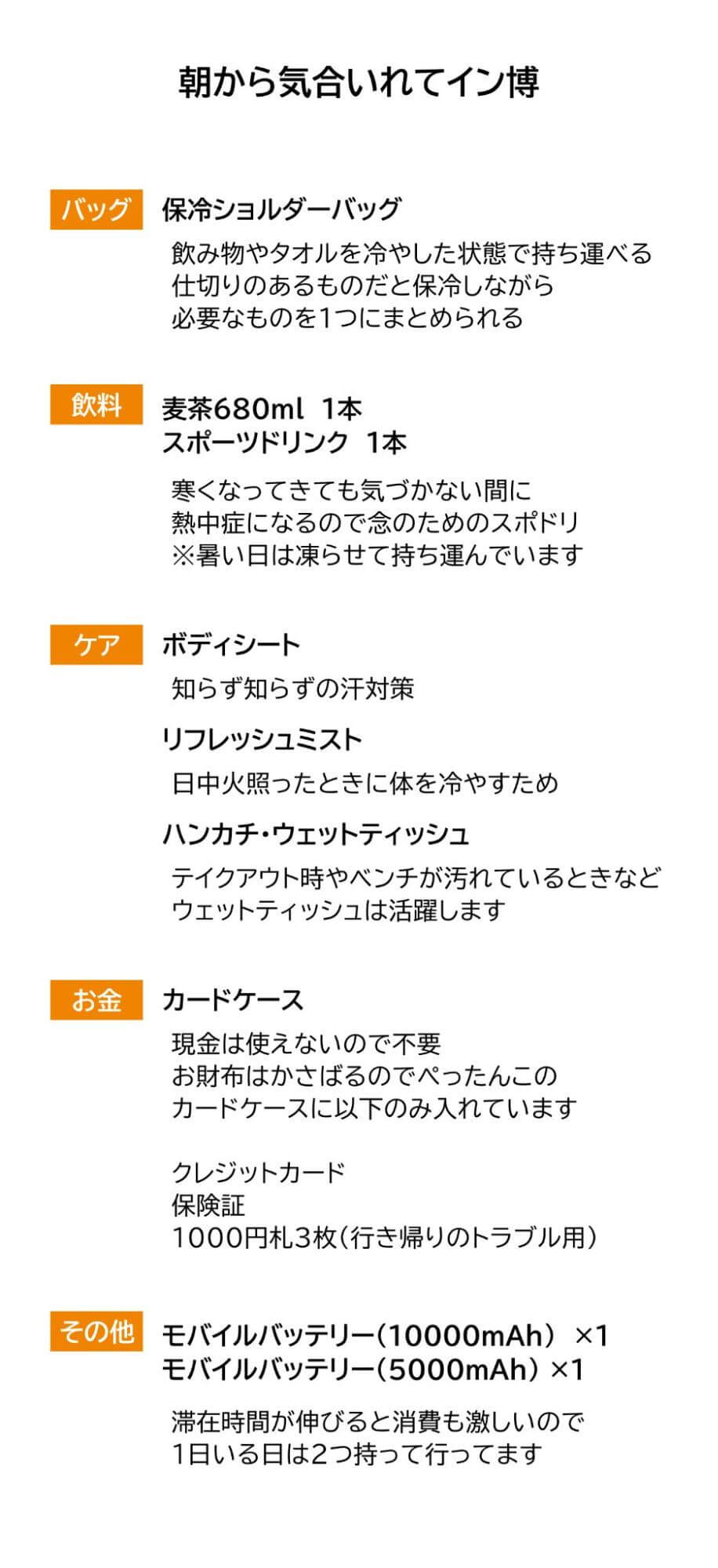 また、回りたいパビリオンの待ち時間が長い場合や、入場時間によってはショルダーバッグになる折り畳み椅子なども持って行っています。