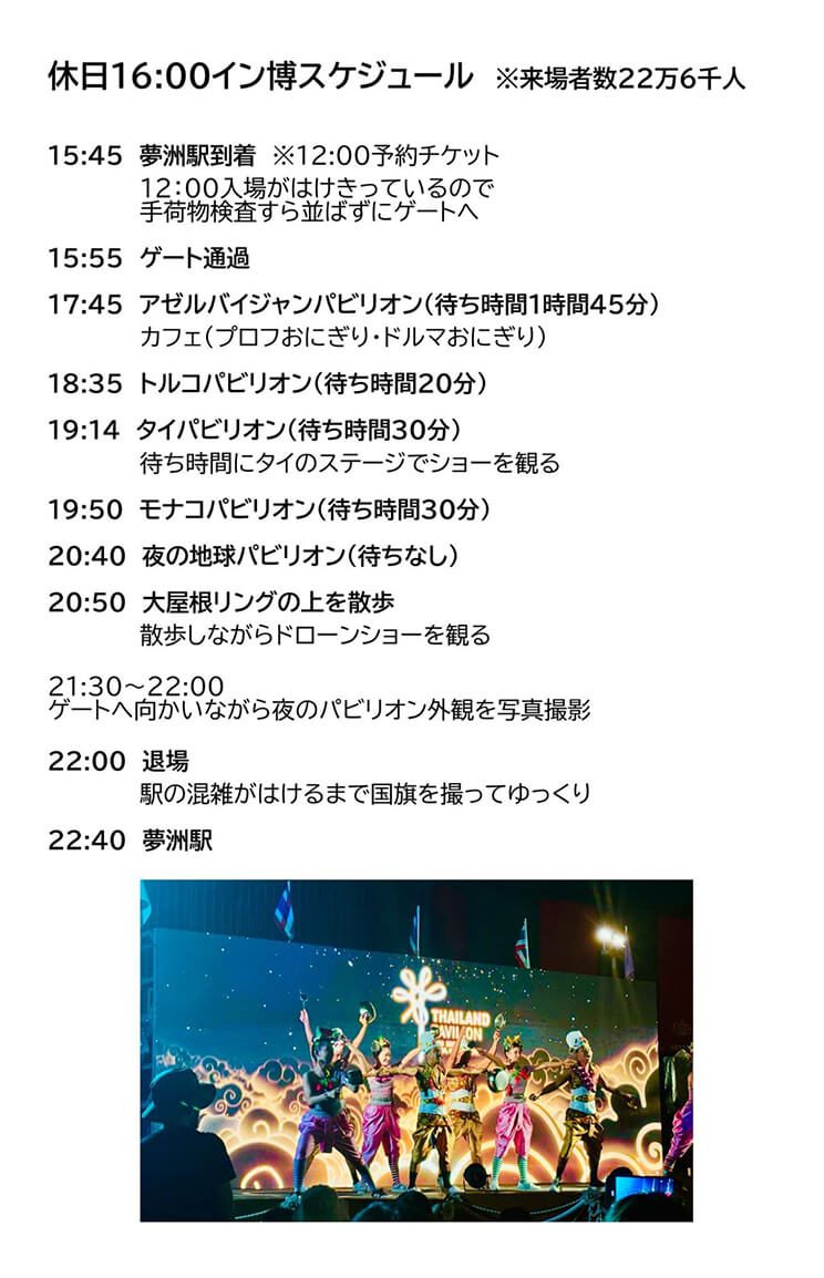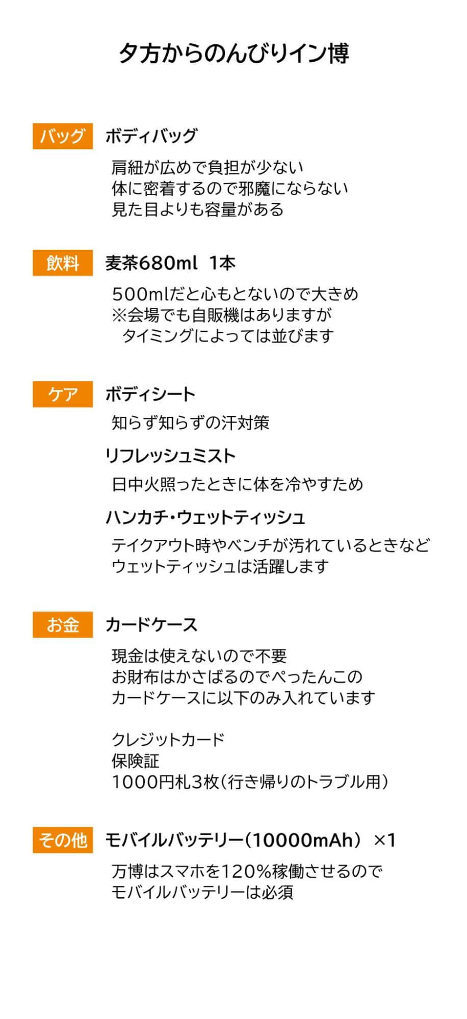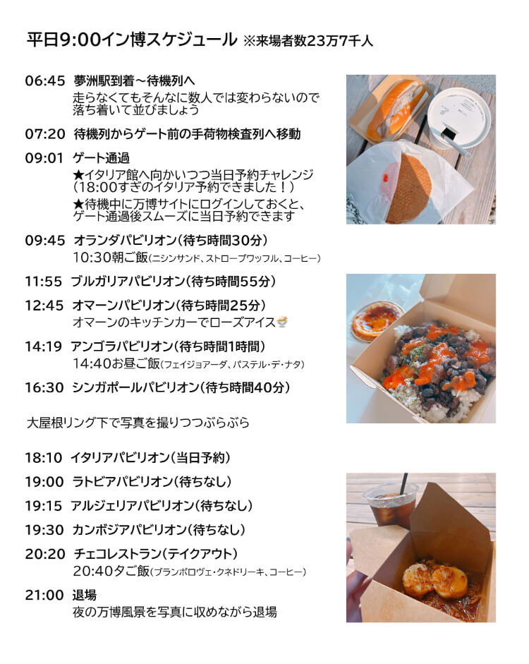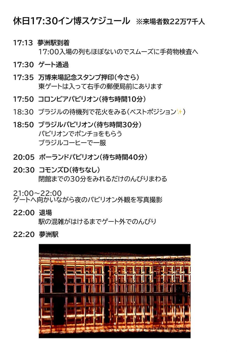 夕方からのゆる万博、朝9時インのガチ万博のスケジュールは